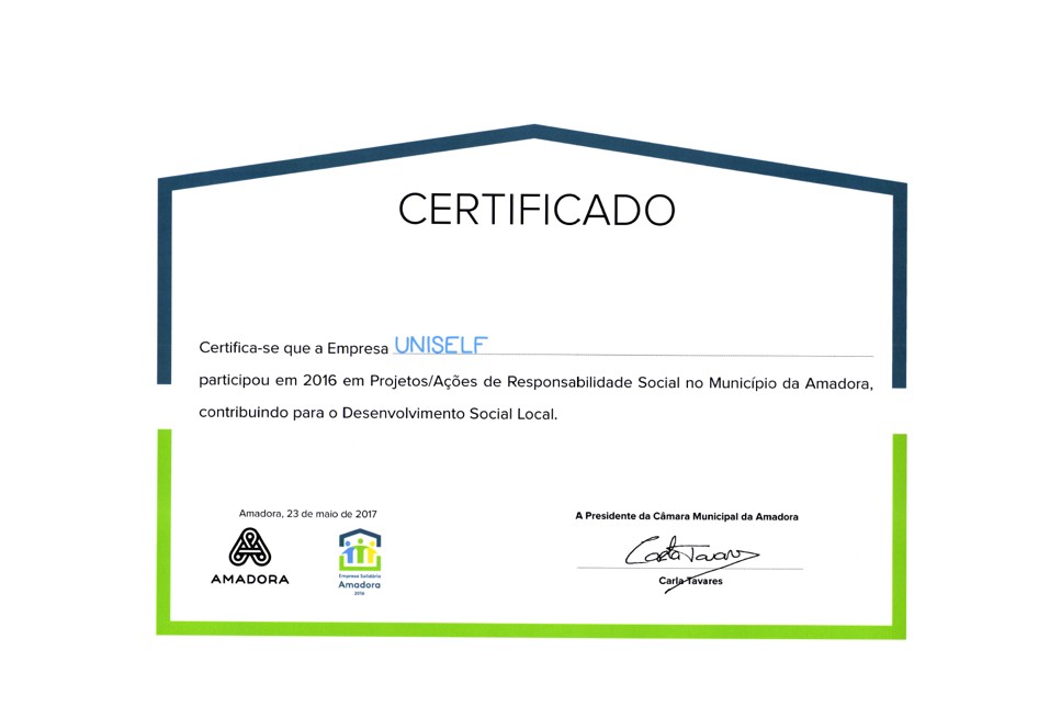Recebemos, com orgulho, por parte da Câmara Municipal da Amadora, o certificado de participação em Projetos/Ações de Responsabilidade Social no Município da Amadora, referentes ao ano de 2016.